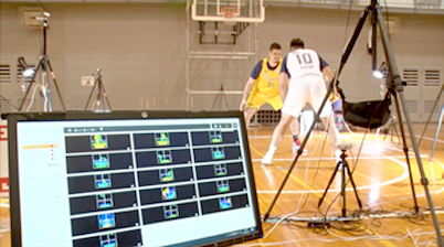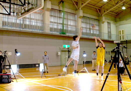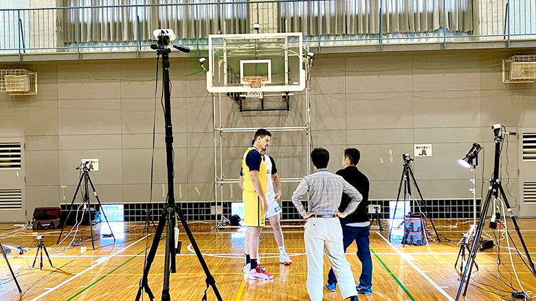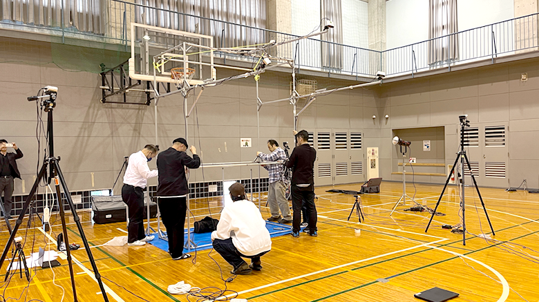 撮影前にカメラポジションを最適化するため、撮影場所の確認を行います。今回の撮影ではダイナミックなアクションを異なる視点から捕捉するため、ゴールリングの上にもカメラを配置。合計16台の専用カメラは、全方位から選手の動作をとらえられるように調整し、高精度に同期させています。